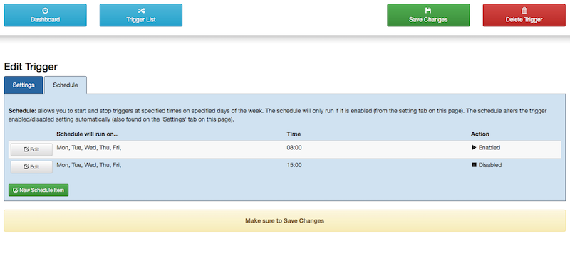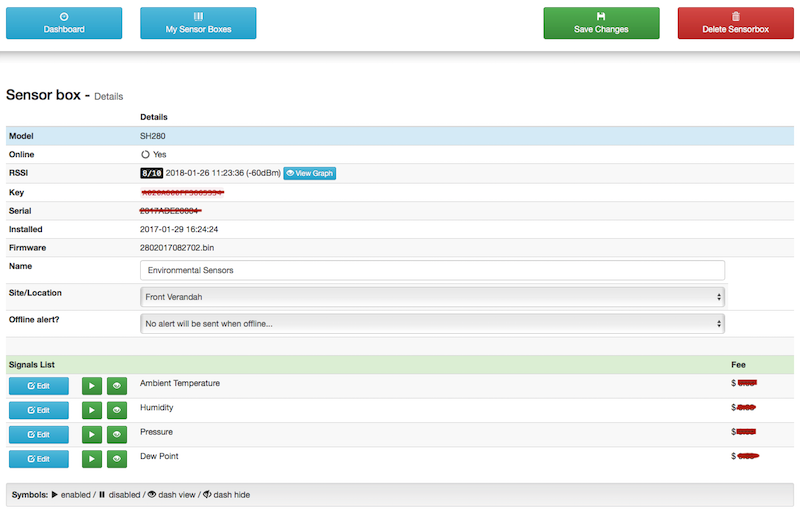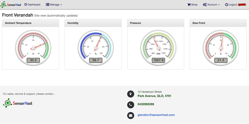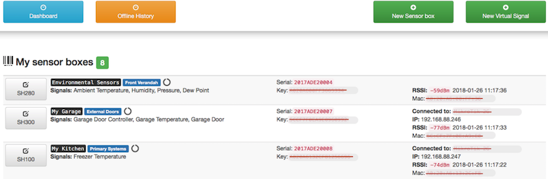 Graph Freezer temperature today until now (11am)Graph Freezer temperature for 7 daysGraph Ambient temperature for 3 daysGraph 7 days of hourly Maximums, Averages, MinimumsGraph 6 months of daily Maximums, Averages, MinimumsGraph Cold room graphDashboard A section of the live dashboardSensor box list Also shows connection details and stateTriggers Full trigger list and statusSchedule Schedule list for single triggerSchedule Edit single trigger schedule itemAlert Edit SMS alertSensor box Status and detailsGauges Live dataSensor Two dual sensorsSensor Single sensor on cold roomSensor Single sensor on cold room